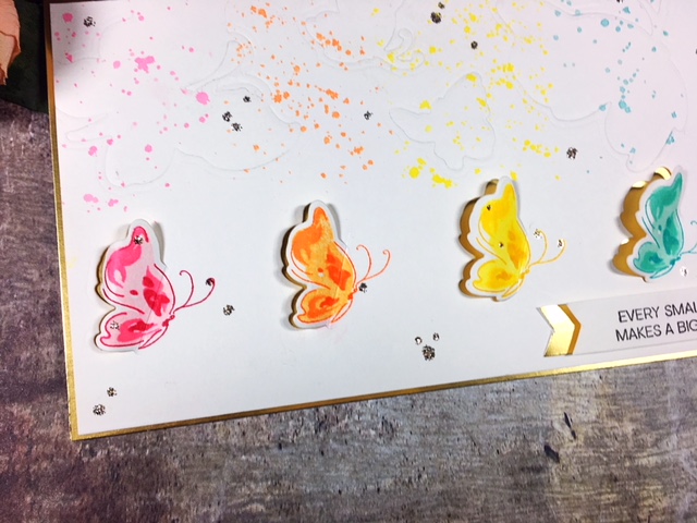 Not so hot. I still couldn’t bring myself to toss it. I finished watercoloring the images with my Kuretaki Gansai Tambi watercolors. Added gold paint splatter and a sentiment from