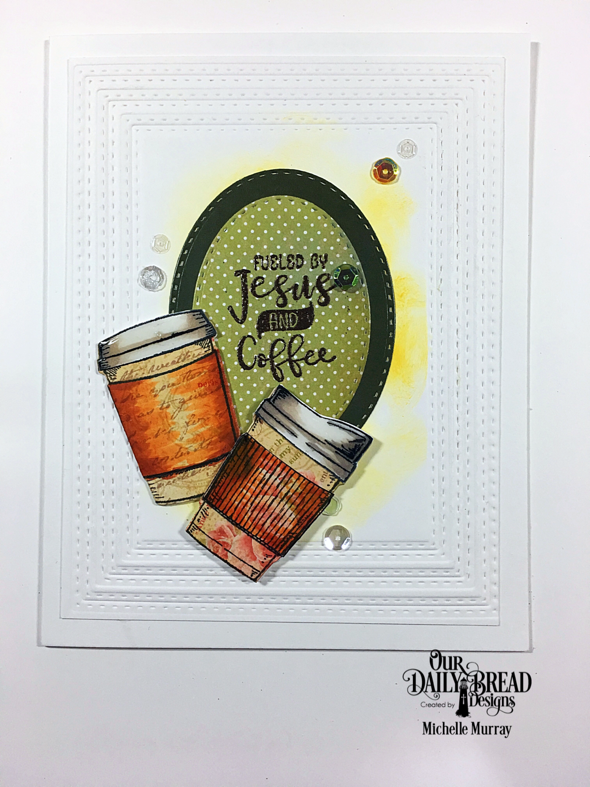- I used the large coffee (or tea) cup from the die set and cut from several of the papers, I also cut some coffee beans (also included in the set) and sprinkled them under the sentiment.